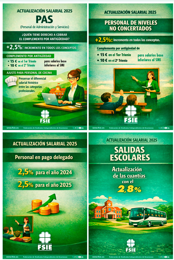 Viernes, 20 Marzo 2026INFORMACIÓN CONJUNTA MESA NEGOCIADORA VII Convenio Colectivo de empresas de enseñanza privada sostenidas total o parcialmente con fondos públicos. Las organizaciones sindicales FSIE, USO y UGT Servicios Públicos hemos alcanzado un principio de acuerdo con las patronales en relación con la actualización de las tablas salariales correspondientes a los años 2024 y 2025. Es un acuerdo que permite cerrar definitivamente el VII Convenio Colectivo y avanzar hacia la negociación del VIII Convenio sin ataduras, ni...