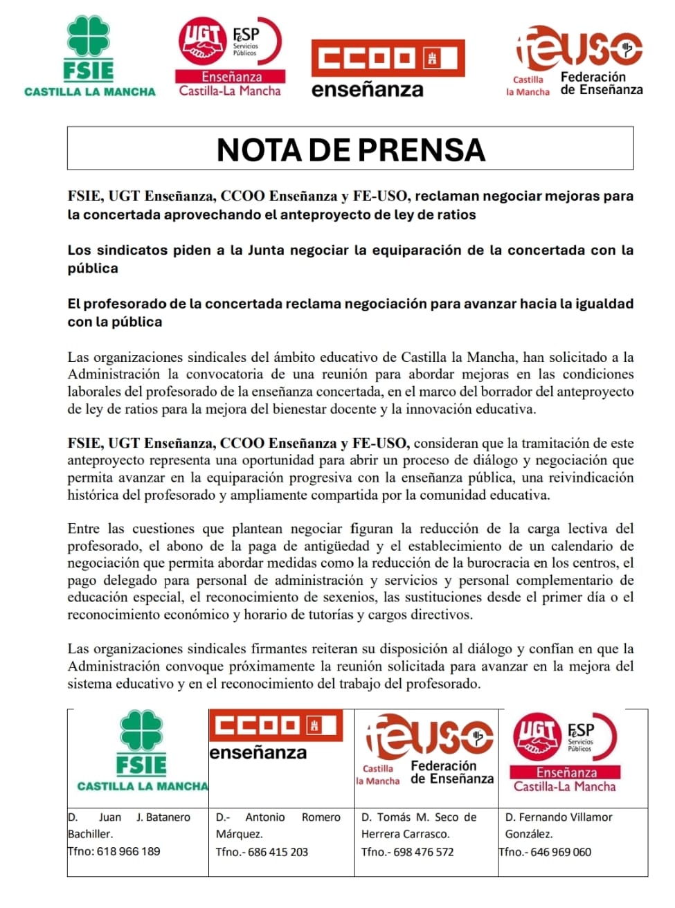 Lunes, 16 Marzo 2026Las principales organizaciones sindicales del ámbito educativo en Castilla-La Mancha (FSIE, CCOO, UGT y FEUSO) han registrado un escrito conjunto dirigido a la Consejería de Educación, Cultura y Deportes, encabezada por Amador Pastor Noheda, solicitando la apertura urgente de una mesa de diálogo y negociación. El documento surge como respuesta al reciente borrador del anteproyecto de ley de ratios para la mejora del bienestar docente y la innovación educativa. Los sindicatos consideran que este nuevo contexto normativo es la "oportunidad" ideal para abordar reivindicaciones...