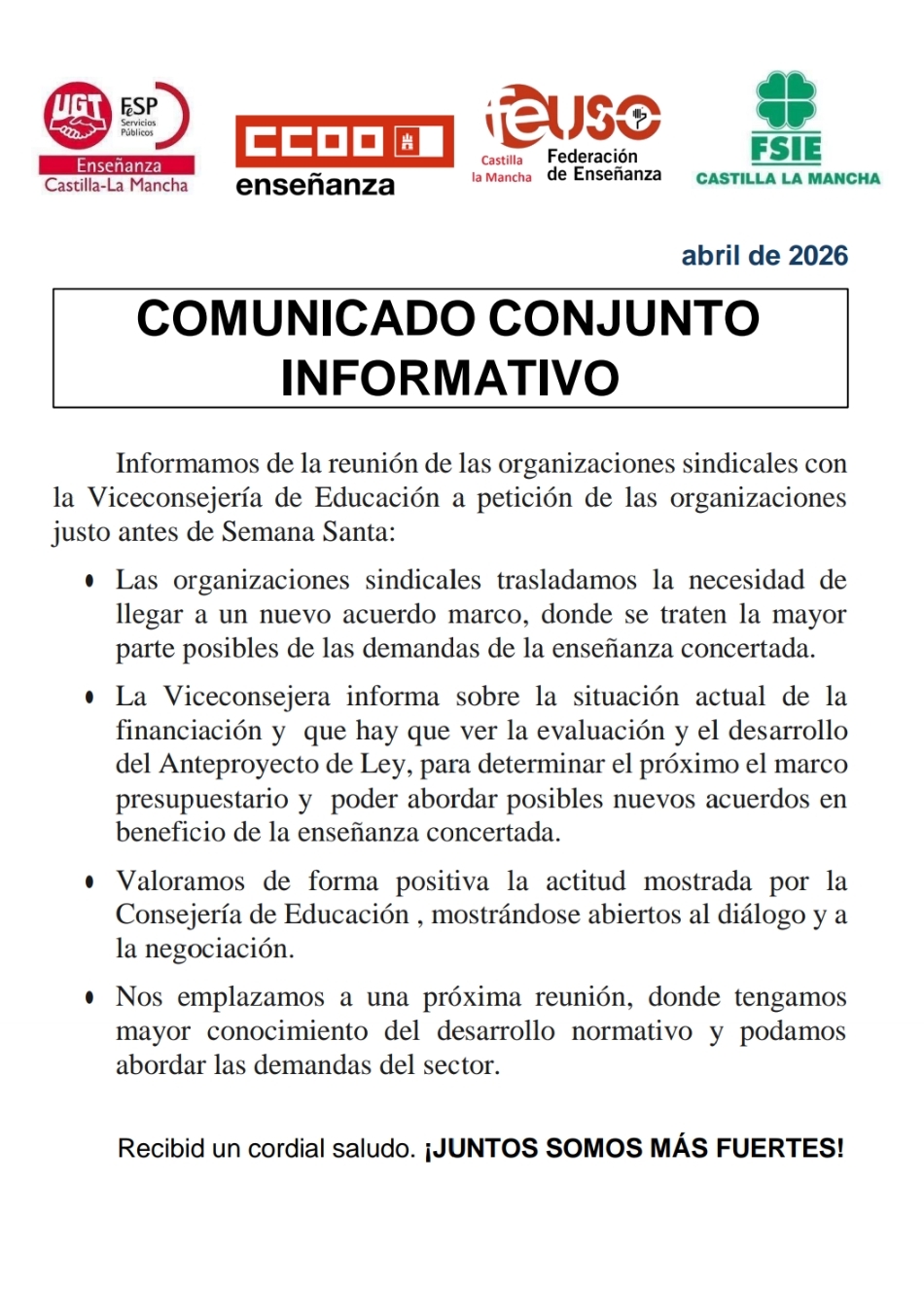 Miércoles, 08 Abril 2026En el marco de la acción sindical conjunta y con el objetivo de dar respuesta a las necesidades del sector, las organizaciones sindicales, entre ellas FSIE Castilla-La Mancha, han mantenido una reunión clave con la Viceconsejería de Educación. El encuentro, solicitado por los representantes de los trabajadores justo antes del periodo de Semana Santa, ha servido para sentar las bases de futuras negociaciones en beneficio de la enseñanza concertada de nuestra región. Un nuevo acuerdo marco en el horizonte Durante el transcurso de la reunión, las organizaciones...