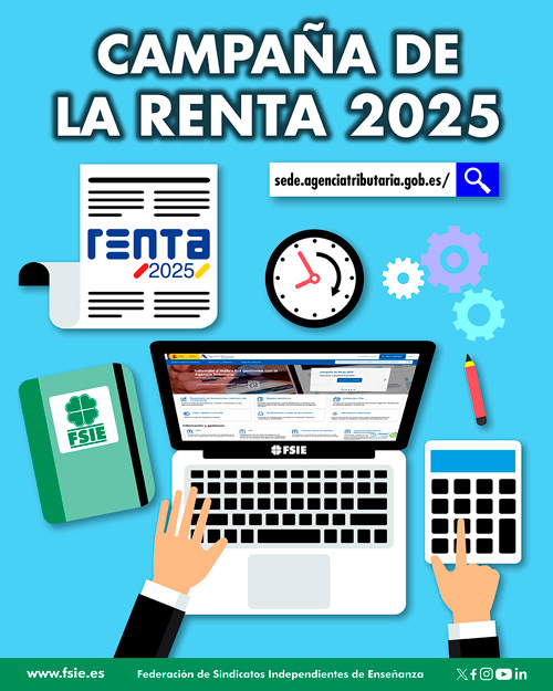 Miércoles, 08 Abril 2026Desde FSIE, queremos recordarte las fechas clave para la declaración de Renta y Patrimonio 2025 que se desarrollará durante la primavera de 2026. Toma nota en tu calendario para planificar tu declaración: Abril: El inicio en internet 8 de abril: Arranca oficialmente la campaña con el inicio del plazo para la presentación de las declaraciones de Renta y Patrimonio 2025 de forma telemática a través de Renta WEB. Desde FSIE te recordamos que esta es la opción más rápida y cómoda. 29 de abril: Se abre el plazo para solicitar cita previa si deseas que la Agencia...